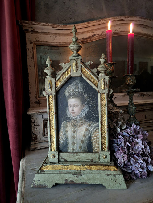 Véritable théâtre miniature de l’élégance, ce petit cabinet apportera une touche totalement unique à vos murs avec sa magnifique face ornée d’un superbe médaillon représentant le portrait d’Isabelle Claire Eugénie d’Autriche peint par Alonso Sánchez Coello.