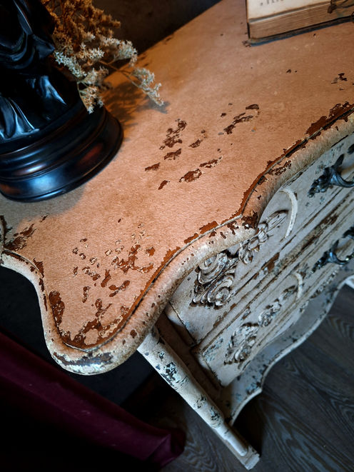 Cette magnifique petite console aux courbes douces – qui lui confèrent une allure romantique et distinguée – incarne tout le charme intemporel du style rococo français avec sa patine rose saumoné vieilli et sa peinture écaillée qui laisse apparaître des nuances de bois brut et d’anciens vernis, témoins d’un travail artisanal d'une grande finesse.