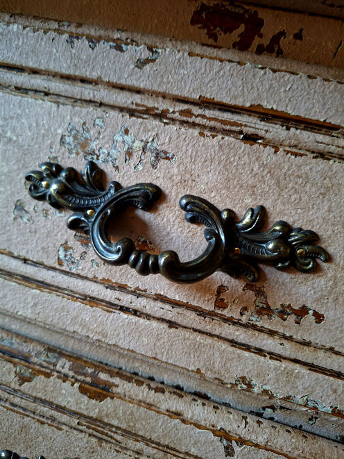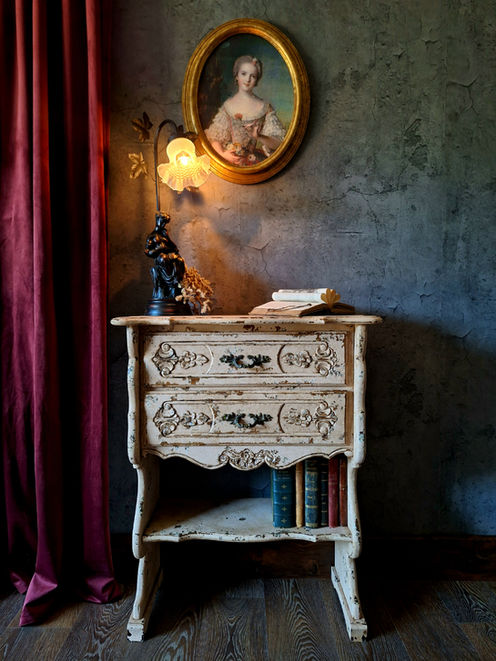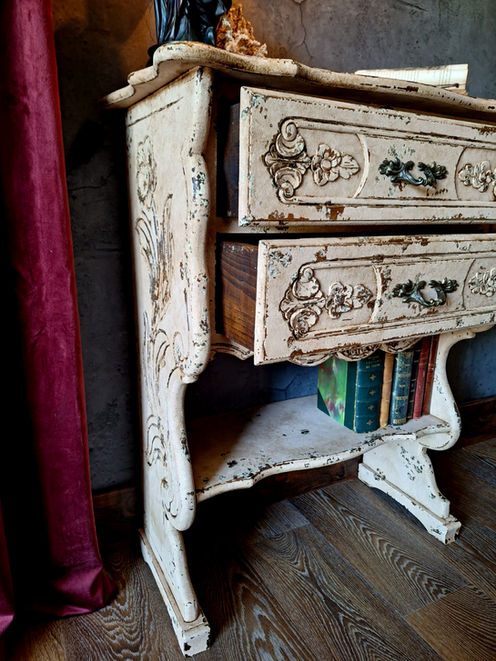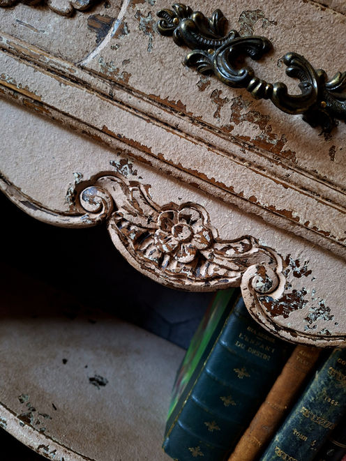 Les tiroirs sont finement sculptés de motifs floraux en relief, agrémentés de touches de couleur crème qui accentuent leur élégance.