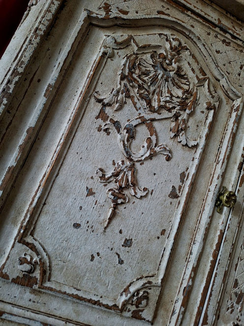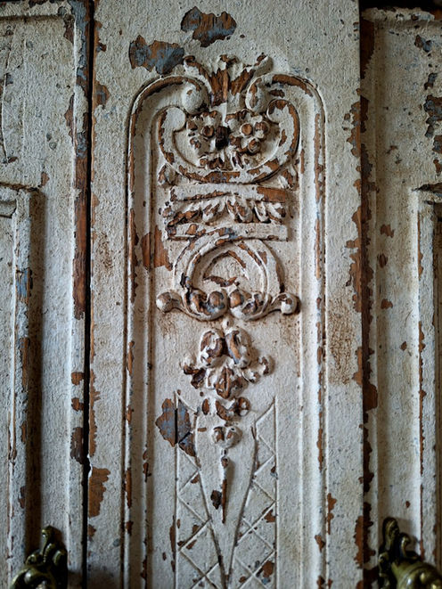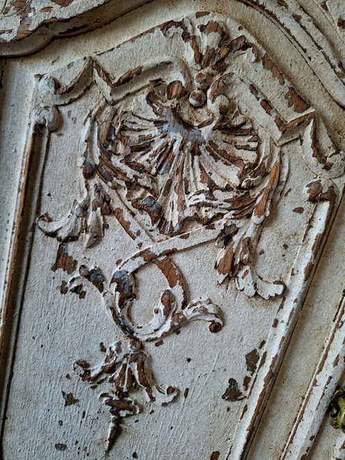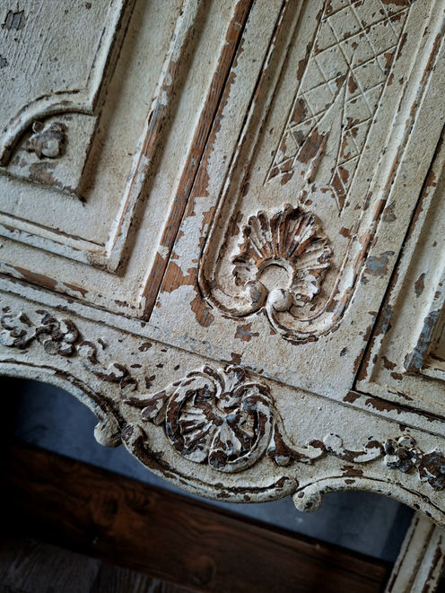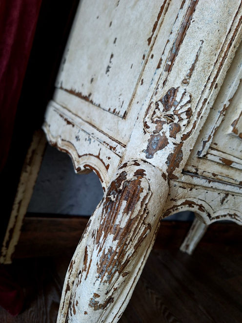 La patine blanche, usée par le temps, dévoile çà et là la chaleur du bois ancien, créant un contraste poétique entre noblesse et fragilité.