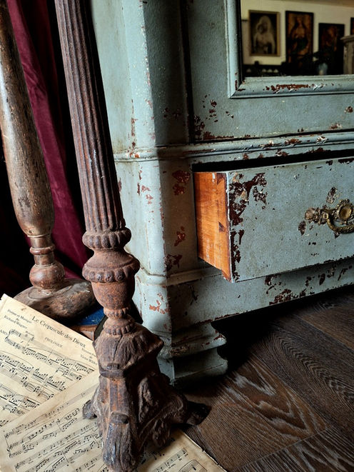 Somptueuse lingère de style Napoléon en acajou peinte en bleu-vert doux vieilli à rehauts de couleur crème et patinée à l’ancienne.