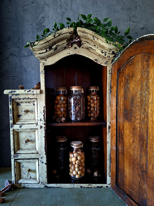 L’ensemble évoque une petite armoire de cabinet de curiosités ou un précieux coffre à secrets d’un autre siècle et sa patine crème, qui révèle un éclat de bois par endroits, crée un subtil contraste visuel qui accentue la profondeur de chaque moulure.