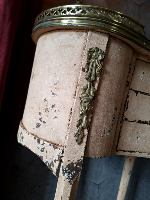 Tout en courbes tendres et en élégance surannée, cette ravissante chiffonnière rognon semble tout droit sortie d’un boudoir du XVIIIe siècle avec sa patine rose poudré, doucement écaillée, qui lui confère un charme nostalgique, presque romanesque.