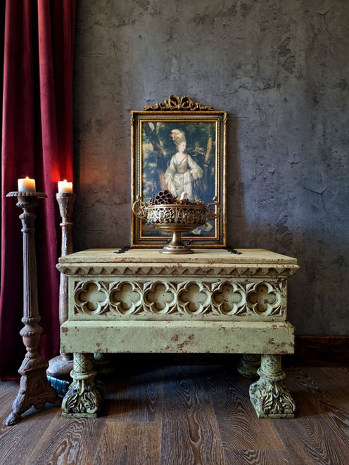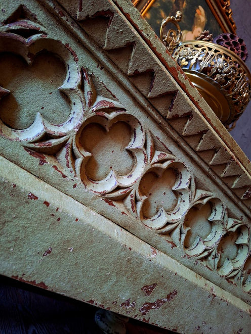 Élevé sur de massifs petits pieds sculptés comme des chapiteaux feuillagés, il s’impose avec humilité et noblesse tandis que ses motifs de quadrilobes rappellent les vitraux d’un cloître.