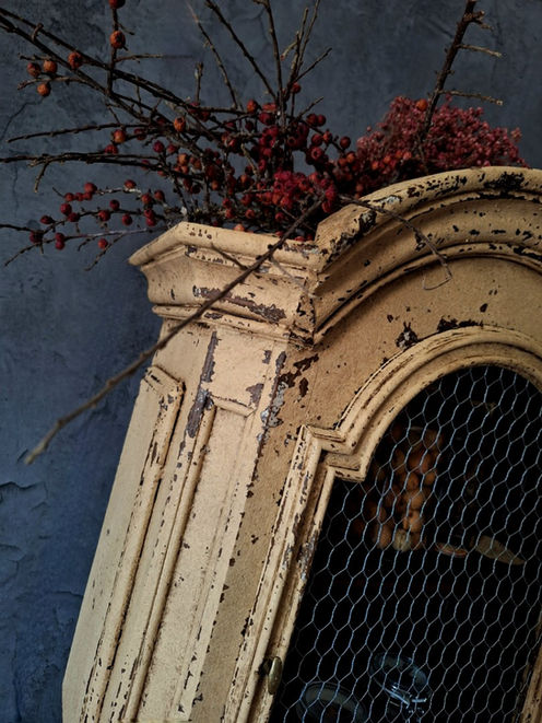 Idéale dans une cuisine où épices et pots en tout genre trouveront une place de choix sur l’étagère intérieure, juste derrière le vantail grillagé plein de charme surmonté d’une belle corniche en chapeau de gendarme.