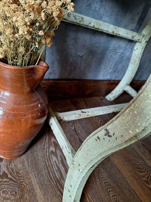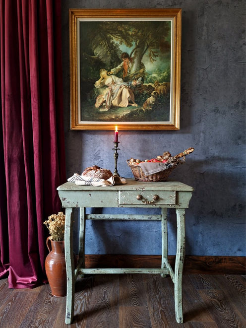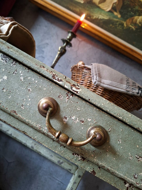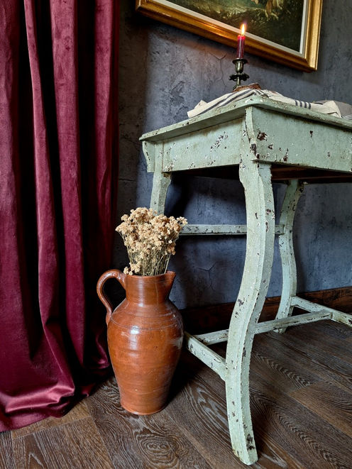 Avec sa silhouette gracieuse et rustique à la fois, ses pieds galbés à l’allure de lyre rustique et sa patine verte, cette table de travail évoque le murmure discret d’un intérieur de campagne d’antan où chaque éclat de peinture et chaque imperfection du bois racontent une histoire, comme un secret chuchoté à travers les décennies.