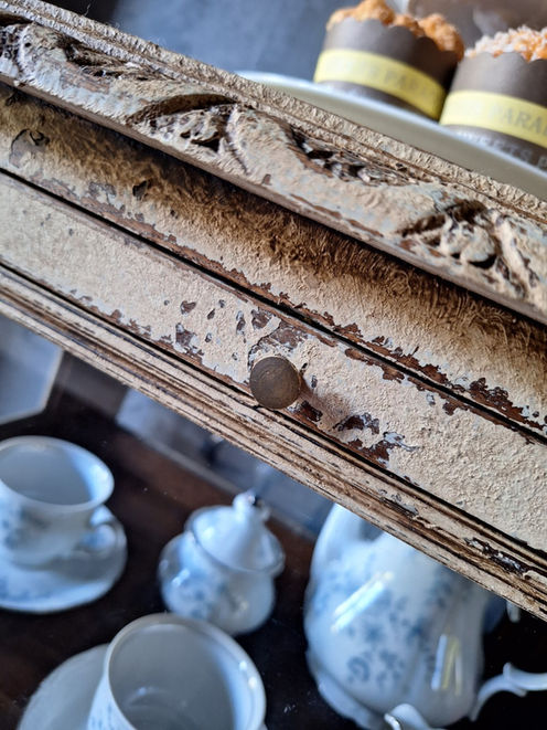 Superbe meuble à thé en chêne de style Chippendale peint en crème foncé à rehauts bleu pâle et patiné à l’ancienne.