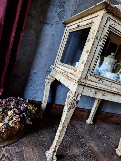 Très élégant et intemporel, ce magnifique petit meuble à thé doté de quatre portes en verre à abattant et de longs pieds ornés de superbes feuilles d’acanthe rappelle les demeures d’autrefois où l’heure du thé était synonyme de raffinement.