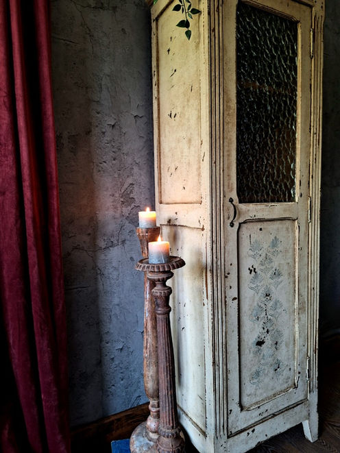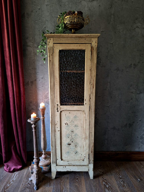 Pratique et élégante avec ses beaux motifs typiquement Art Nouveau qui ornent le bas de la porte surmonté d’une belle vitre martelée, cette armoire en forme de colonne offre un bel espace de rangement et sera parfaite dans une cuisine, une chambre ou même une salle de bain pour y entreposer pots et bocaux, linges de bain et produits de beauté en tout genre.
