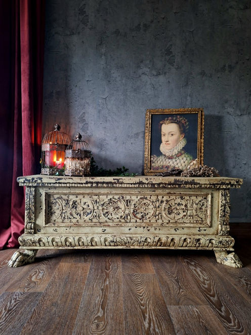 Magnifique coffre en peuplier de style Renaissance peint en gris-vert vieilli à rehauts blancs et patiné à l’ancienne.