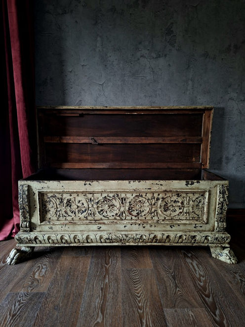 Plein de caractère avec ses superbes pieds à pattes de lion, sa face sculptée et ses palmettes latérales, il sera parfait dans un hall ou au pied du lit où couettes et coussins auront une place de choix, dissimulés sous le beau couvercle à bord sculpté.