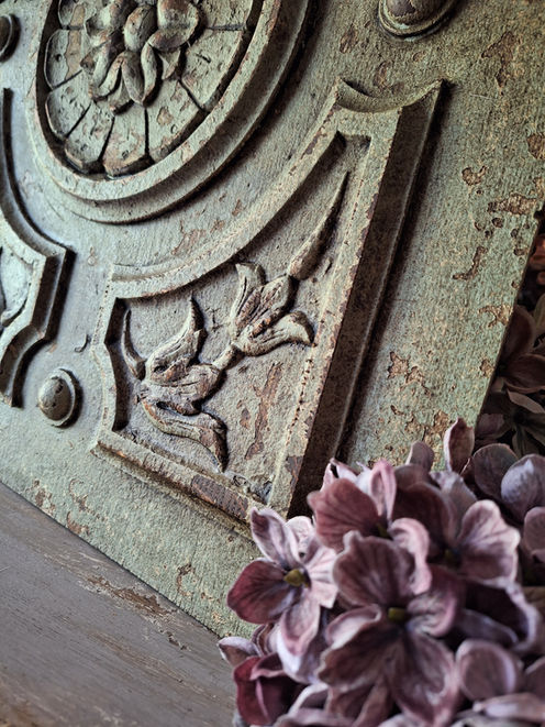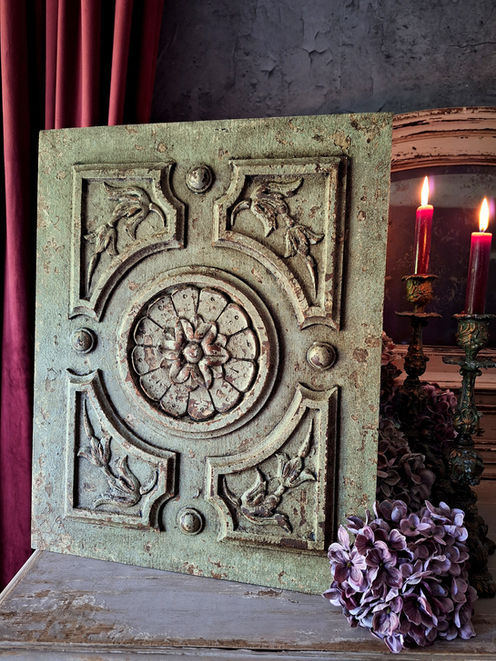 Jadis élément décoratif de boiseries ou de meubles Haute époque, ce magnifique panneau en chêne richement sculpté de style Renaissance a été patiné à l’ancienne et peint dans une teinte gris-vert à rehauts de couleur crème pour apporter à votre intérieur une touche unique et élégante qui rappelle les demeures d’autrefois.