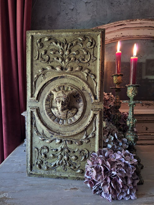 Jadis élément décoratif de boiseries ou de meubles Haute époque, ce magnifique panneau en chêne richement sculpté de style Renaissance a été patiné à l’ancienne et peint dans une teinte vert foncé à rehauts crème pour apporter à votre intérieur une touche unique et élégante qui rappelle les demeures d’autrefois.