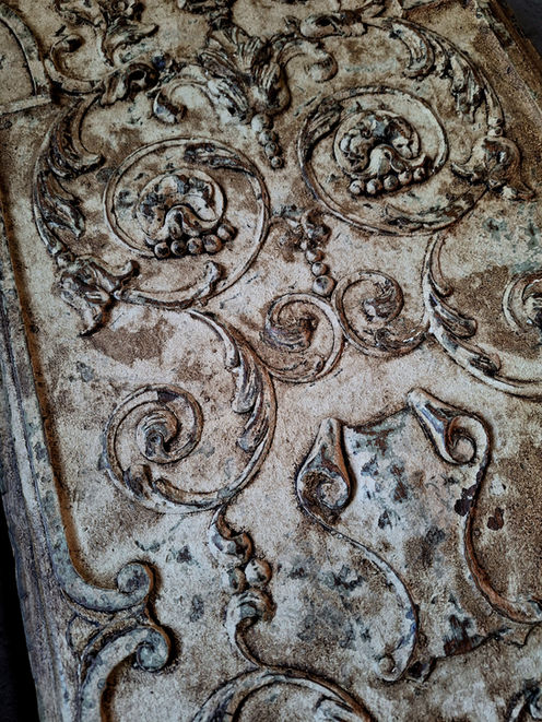 Jadis élément décoratif de boiseries ou de meubles Haute époque, ce magnifique panneau en chêne richement sculpté de style Renaissance a été patiné à l’ancienne et peint dans une teinte beige foncé à rehauts verts pour apporter à votre intérieur une touche unique et élégante qui rappelle les demeures d’autrefois.
